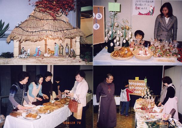 いつもこの日に教会に馬小屋をつくります。下はホールのミニバザーの様子です。